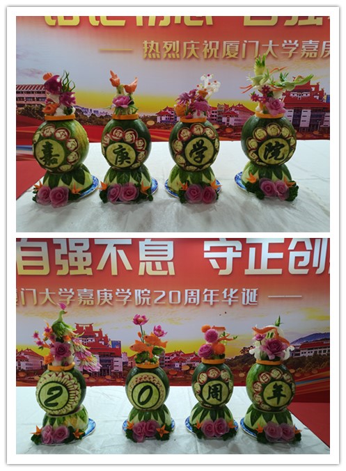 除了校庆套餐外,餐饮部还专门为校庆制作了三层、底层直径1.4米的蛋糕,为校庆晚会制作了两层、底层直径0.6米的蛋糕,为嘉庚学院二十周年校庆送上甜蜜的祝福。为了保证校庆三层大蛋糕的新鲜美味,支援校区的糕点师们于10月20日傍晚烤好蛋糕胚,21日凌晨即开始拼叠、调制奶油、刮平、点缀水果等,历时20个小时,至21日上午10点多才完成。此外,师傅们还展现雕花技艺,用8个西瓜刻出立体的花、鸟、鱼、虾、蟹和“嘉庚学院20周年”的字样,作为装饰放在蛋糕旁。