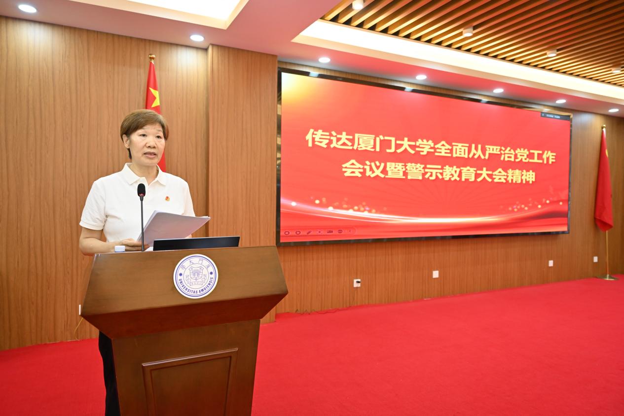 集团党委副书记邓泽君传达厦门大学全面从严治党工作会议暨警示教育大会精神。会议要求全体党员和干部要时刻保持清醒头脑,筑牢思想防线,做到警钟长鸣。