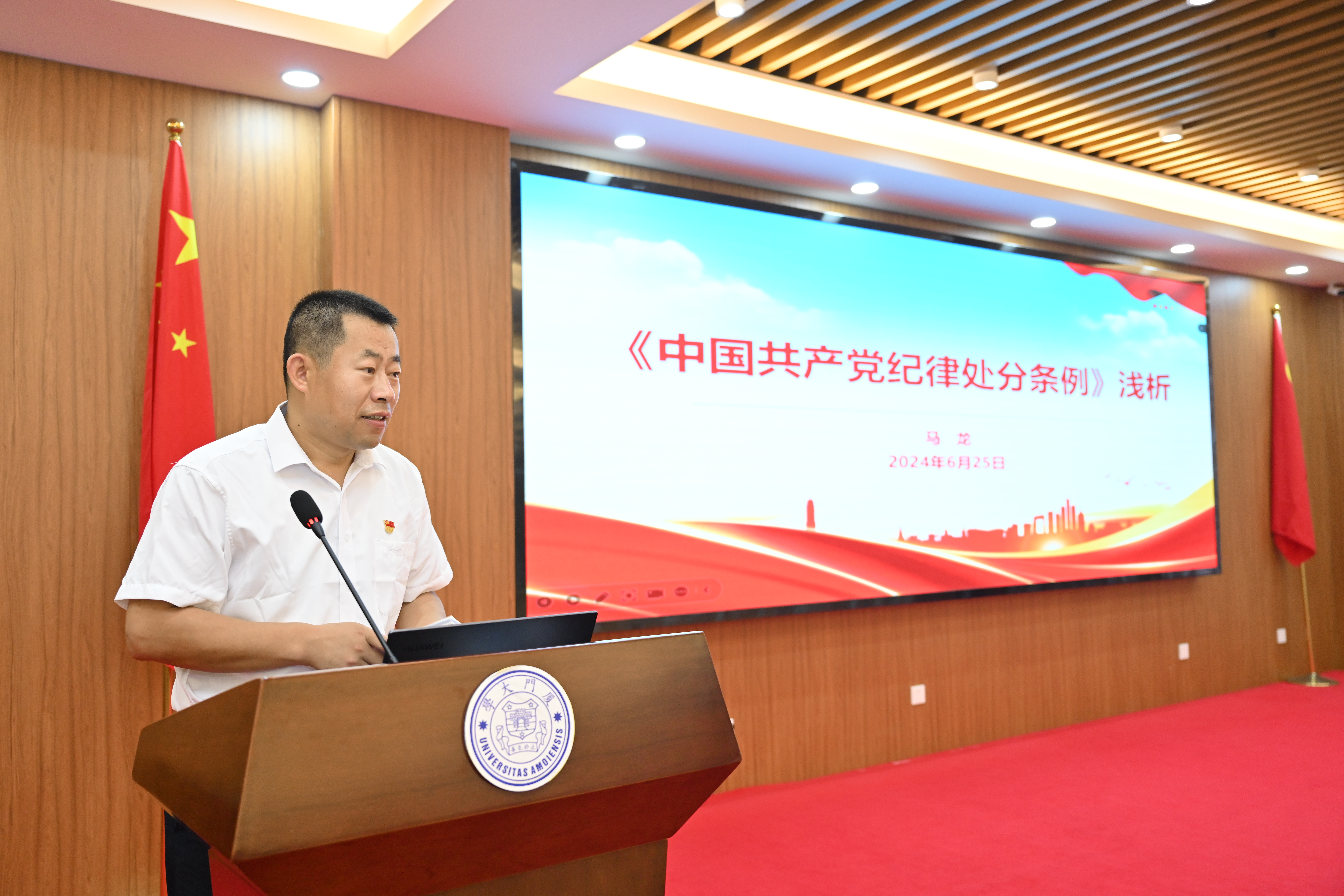在集团二级党校开展专题教学中,集团党委书记马龙上台讲授党课。党课内容紧密围绕《中国共产党纪律处分条例》的内容及其与大学教育、后勤事业的关系进行阐述分析,他以独到的见解和生动的例子,引导与会人员结合后勤工作实际做“四讲四有”党员 、“五好”党支部 和“忠诚、干净、担当”的骨干。