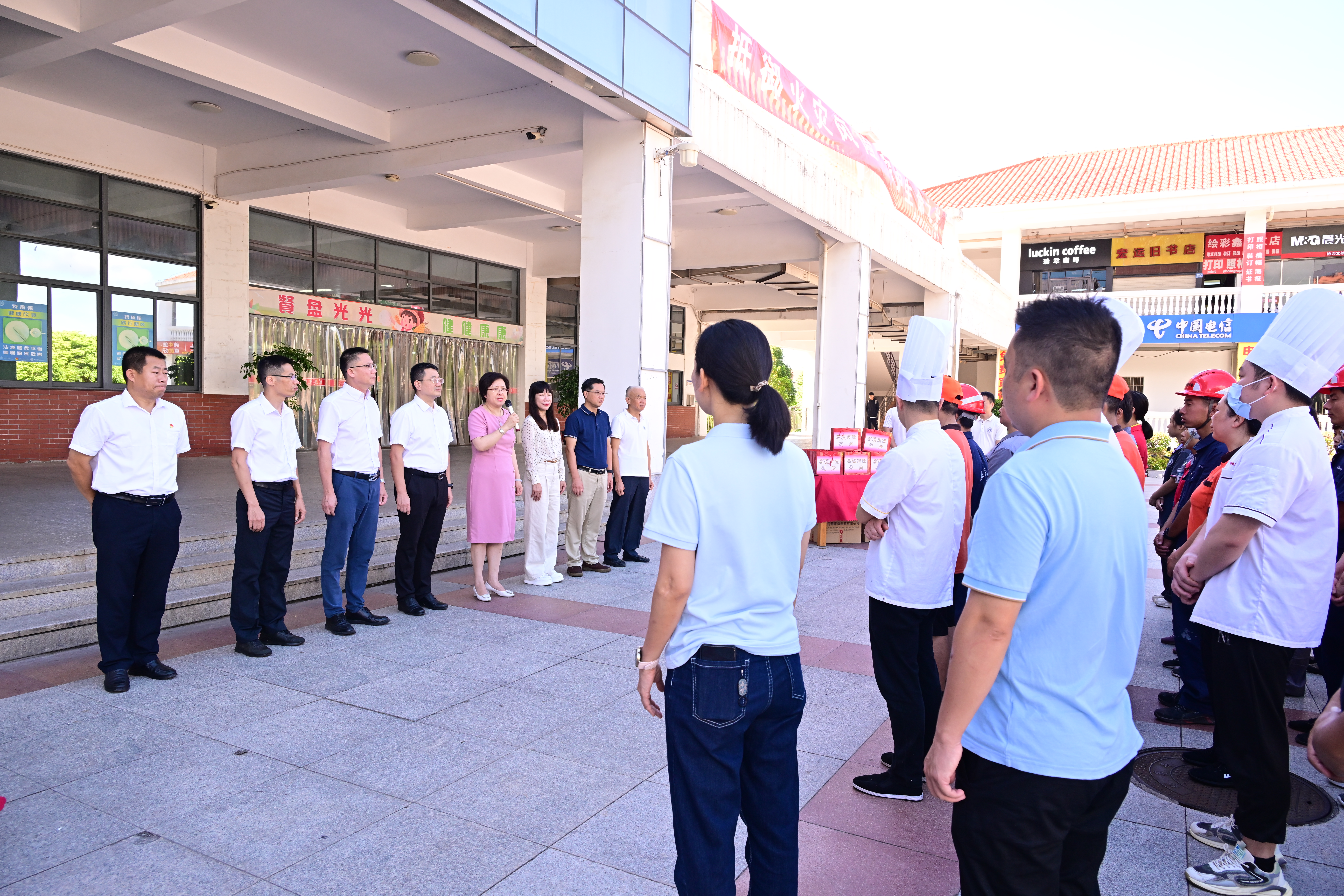 在翔安校区竞丰餐厅前广场,邓朝晖与高温下坚守岗位的五十余名后勤一线员工代表见面。邓朝晖在讲话中高度赞誉了后勤集团近年来在全心全意为师生谋福祉、不懈推动服务育人方面所取得的卓越成就,并代表学校及校工会,向在后勤服务保障前沿上,以无畏之姿勇挑重担、直面挑战的一线员工们,致以崇高的敬意和衷心的感谢。她表示,学校始终高度重视民生福祉,心系每位后勤员工的工作与生活,尤为关注员工高温作业安全与防暑降温措施。高温岗位慰问活动是校工会贯彻落实以职工为本、关心职工生产生活和健康的举措之一,旨在为奋战酷暑中的一线员工送上丝丝清凉的关怀。邓朝晖殷切叮嘱员工们,高温天气下务必加强个人防护,注重工作与休息的科学结合,有条不紊地开展好暑期及下阶段各项工作,为建设世界一流大学、推动学校新百年发展作出后勤人新的更大贡献。