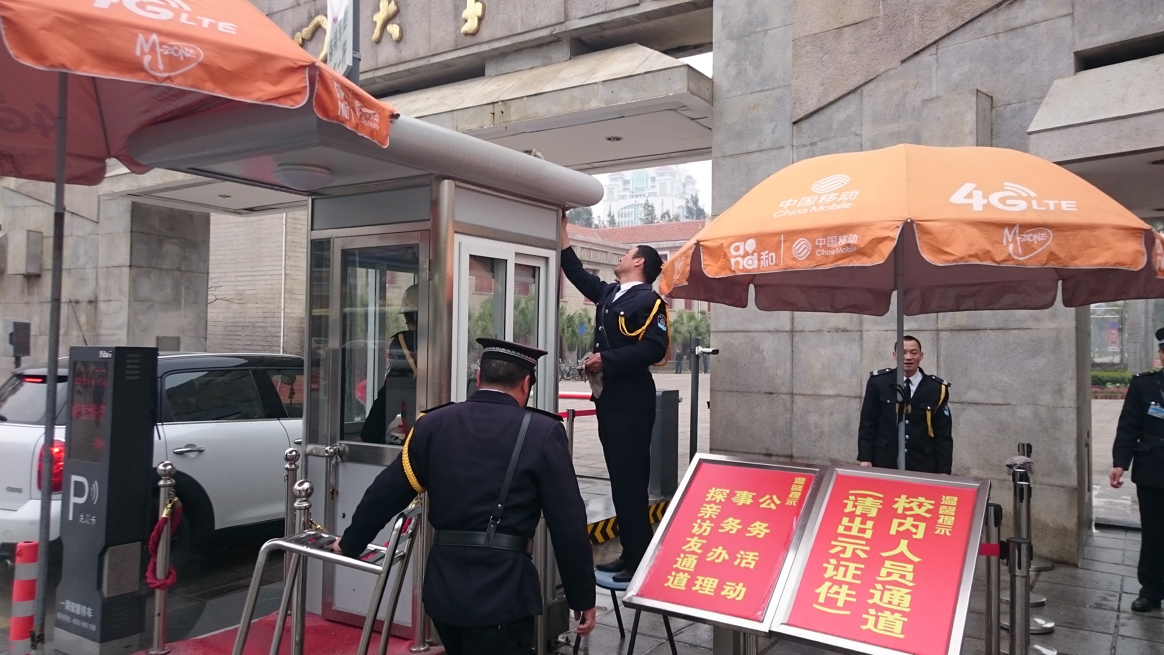校门安防员也抽空把岗亭擦洗得亮堂。