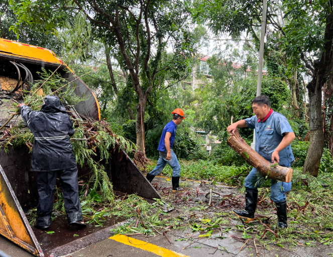学生公寓与环境服务中心应急抢险队第一时间前往各路段清理横栏道路的倒伏树木,三校区共出动绿化保洁人员241人、投入油锯29台,累计清扫、运走树尾巴、落叶杂物、淤积泥沙、生活垃圾等76车,校园主干道迅速恢复畅通、整洁。