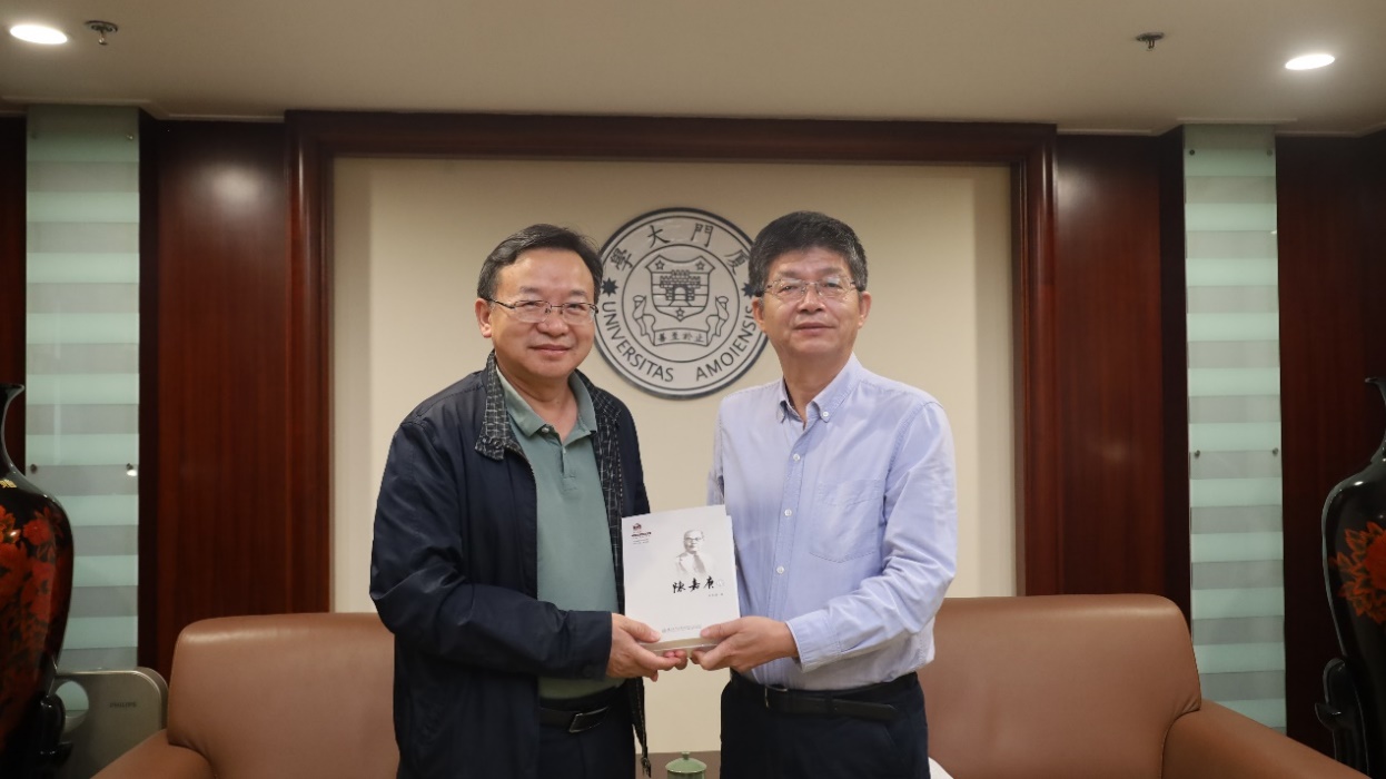 徐进功首先对刘怀德一行来访表示欢迎,他介绍了学校历史和建筑风格,并赠予对方学校纪念书《厦门大学百年校史》和《陈嘉庚传》。