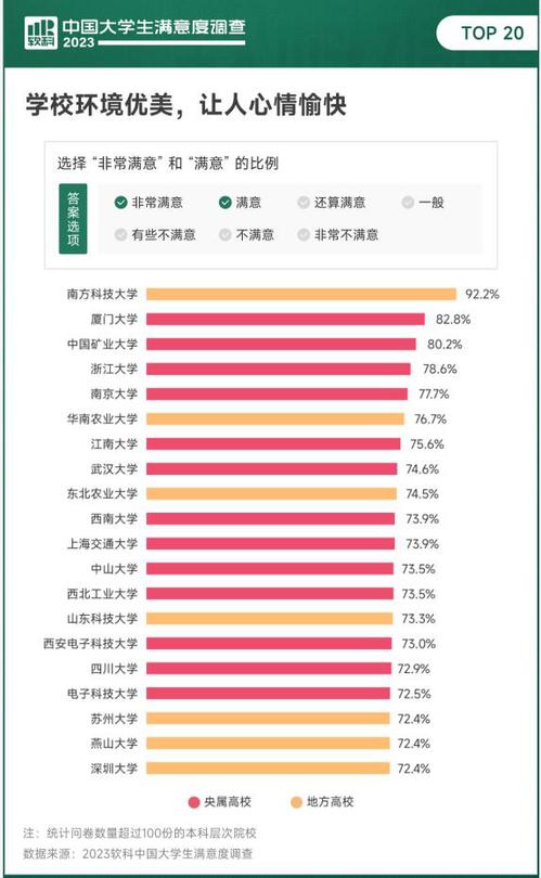 校园环境第二名。校园环境方面,南风北韵,各有千秋。其中,南方科技大学选择满意或非常满意的学生比例高达92.2%,位居全国第一。厦门大学以82.8的比例位居继续获得第二名。