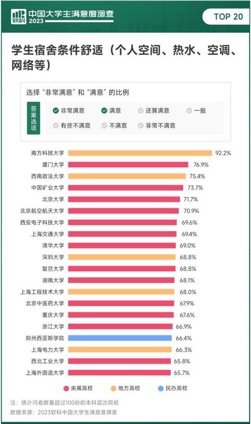 宿舍条件第二名。“学生宿舍条件舒适”也是广大学子密切关注的重要校园生活体验之一。南方科技大学以92.2%的比例获得本校学子的高度认可排名第一。厦门大学76.9%比例获得学生对学校的宿舍条件表示非常满意、满意挂名第二。