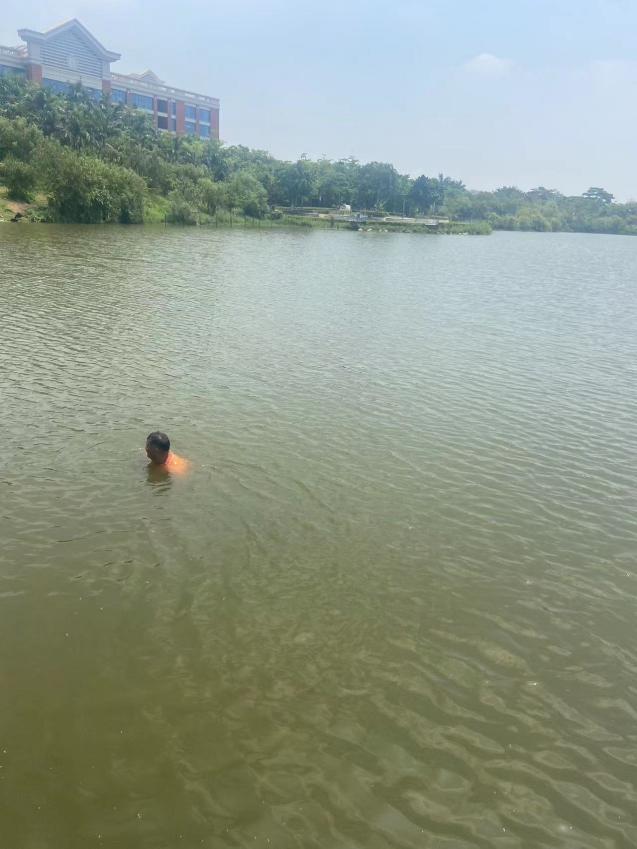 “水太浑浊,捞网没有用啊!”饶鑫、吴茂海与该学生在手机落水点周围打捞了一阵后,没有找到。在安抚完该学生情绪后,熟悉水情的饶鑫和吴茂海便自告奋勇下水打捞手机,同时决定进一步扩大搜寻范围。芙蓉湖中,饶鑫和吴茂海顶着炎炎烈日,在齐肩的水里艰难地打捞寻找。终于,经过十几分钟的搜寻,成功找回掉落的手机。事后,该学生拿到失而复得的手机,对饶鑫和吴茂海的热心帮助表示衷心感谢!