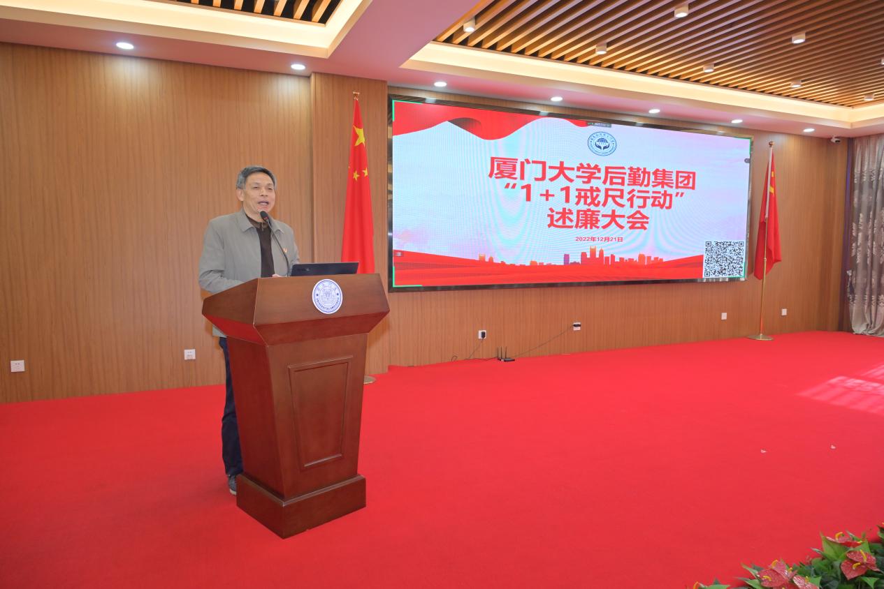 12月21日上午,后勤集团在东苑餐厅二楼召开“1+1戒尺行动”述廉大会,集团党建工作联络员郑建华,集团领导班子成员、各单位一级岗人员、党支部书记及工青妇负责人参加,集团其他党员通过线上分会场同步参会。