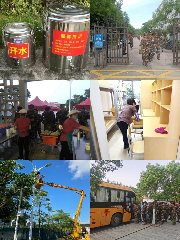 水电管理部每日对军训场地照明进行巡查并在网球场新增投光灯,保障军训场地照明;餐厅服务部各餐厅增设服务窗口,提前和延长就餐时间,增加菜肴的花色品种,特别是丰庭餐厅承接军训教官用餐,专门提供独立区域,设置独立窗口。另外,相较于往年,今年军训时段较为炎热,凉茶和盐水需求量急剧上升,餐厅及时检查补给;运输服务部及时协调车辆为漳州校区双创学院学生往返、本部学生军训动员大会往返及教官日常出行提供用车保障;校园服务部及时协调243间宿舍为双创学院的学生及辅导员提供保障,军训时间段开放二期田径场笃行园区大门,方便学生出入。另外,校园服务部还增派保洁员,不定时对运动场、校区道路、宿舍园区等进行清扫和消毒,为学生创造干净舒适的环境。