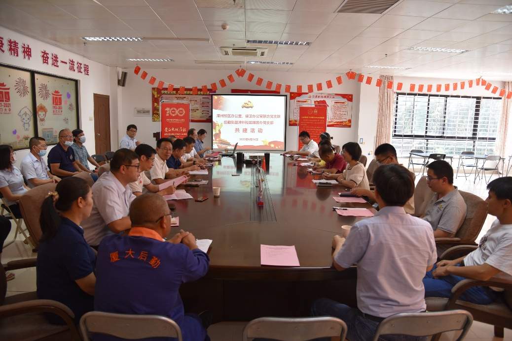 6月初,受周边社区疫情影响,漳州校区全面打响了防疫阻击战,校区各单位凝心聚力连续奋战,让党旗在抗疫一线高高飘扬。为进一步强化党建引领,漳州校区办公室、保卫办公室联合党支部以及后勤集团漳州校区服务办党支部于6月24日上午联合开展支部共建,深入交流在此次校区疫情防控工作中的做法和经验,从抗疫实践中汲取前进动力和精神力量。漳州校区办公室、保卫办公室联合党支部书记王智兰主持会议,漳州校区管委会主任黎永强,后勤集团总经理杨旸、副总经理王裕民到会指导。