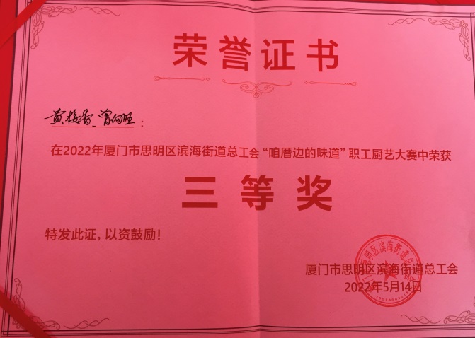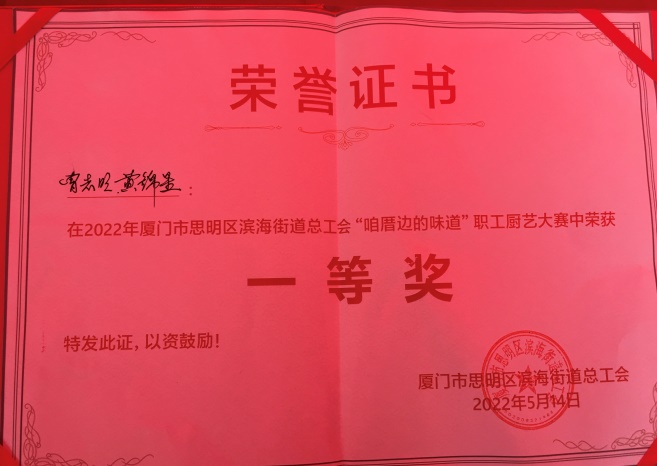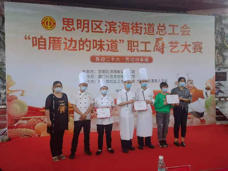 5月14日下午,厦门市思明区滨海街道总工会“咱厝边的味道”职工厨艺大赛在曾厝垵后厝净圣堂热闹举行,科技中学厦大餐厅的厨师队伍代表厦门南强后勤服务有限公司参赛,与其他9组职工代表队同台竞技、比拼厨艺,最终我司制作的椒盐猪手烩鲍鱼荣获一等奖、糖醋排骨获得三等奖!