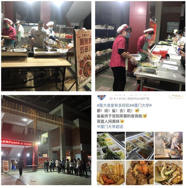 为满足师生的需求,3月19日学校实行封闭式管理以来,后勤集团在思明校区增加主楼、凌云片区、石井片区、芙蓉隧道口、学生公寓门口、海韵16门口等六个供餐点的基础上,三校区各餐厅纷纷增加夜宵供应,比如思明校区本部勤业餐厅、芙蓉餐厅、海滨餐厅和公寓一期餐厅,翔安校区丰庭餐厅、芙蓉餐厅、竞丰餐厅,漳州校区中区餐厅,勤业餐厅还把餐车开到海韵学生公寓园区现煮现卖,深受师生欢迎。这是后勤集团三校区各餐厅全心全力服务、为师生办实事的重要举措之一。