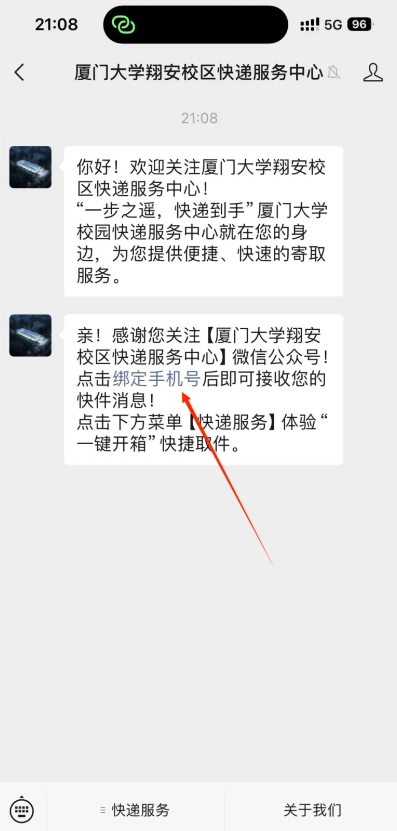 1.关注“厦门大学翔安校区快递服务中心”微信公众号后点击“绑定手机号”。
