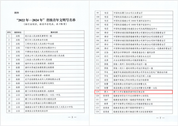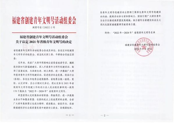 近日,福建省创建青年文明号活动组委会印发《关于认定2021年省级青年文明号的决定》,认定参与2021年省级青年文明号创建工作中的178个集体为2022—2024年“省级青年文明号”,华人策略celue漳州校区物业部位列其中。