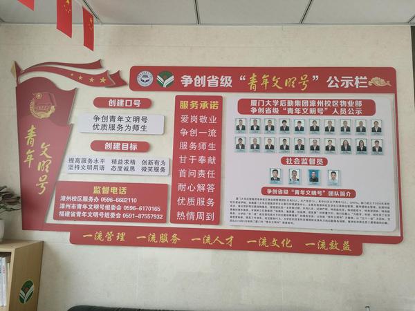 漳州校区物业部青年文明号是一支充满朝气、团结协作、创新诚信的青年文明团队。集体成员20人,其中党员8人,35岁以下青年12人。主要承担漳州校区学生公寓、教学楼物业管理、校园环境保洁和绿化养护管理等后勤保障服务。团队始终秉承厦门大学“自强不息、止于至善”的校训,将敬业、协作、创优、奉献的青年文明号精神理念融入到各项服务工作中,扎实为学校“双一流”建设提供高水平的后勤保障服务。