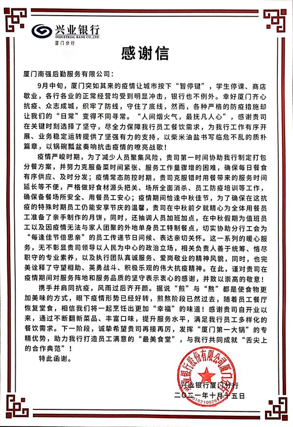 2021年秋季,一场突如其来的新冠疫情迅速侵袭了厦门,在全员抗击疫情的无声战场上,厦门南强后勤服务有限公司(厦大餐饮)坚守岗位,冲锋在前,在做好疫情防控的同时,切实保障各餐厅的安全稳定供餐,为各甲方单位的餐饮后勤保障提供强有力的支持。疫情过后,兴业银行厦门分行为我司送上感谢信,感谢我方用最靠谱的后勤,筑起兴业银行厦门分行员工舌尖上的美味。