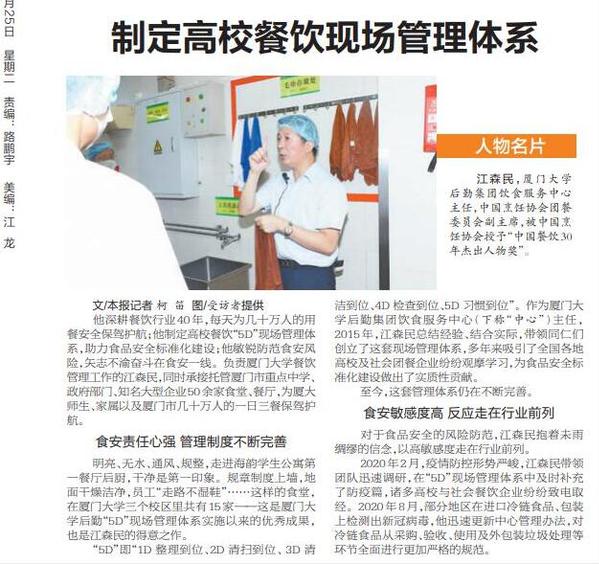 下面是5月18日厦门日报第8版刊登《制定高校餐饮现场管理体系》,介绍第二届厦门市“十佳食安卫士”候选人江森民的典型事迹: