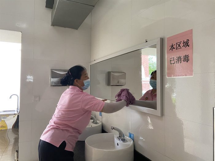 保洁人员擦拭洗手间镜面