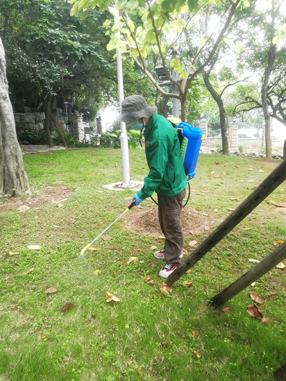 绿化人员为草地喷洒药物