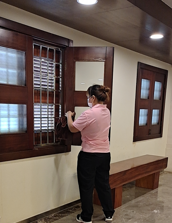 保洁人员擦拭展馆内窗户