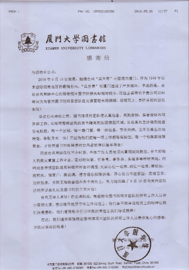 上一篇:厦门大学公共卫生学院致后勤集团的感谢信