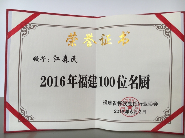 饮食服务中心江森民同志喜获福建省烹饪行业协会授予的“2016年福建100位名厨”荣誉称号。