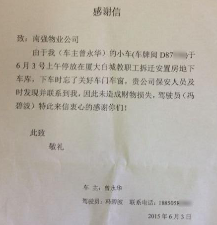 海韵北区项目6月受表扬二三事 敬业负责,收获感动 6月3日上午,海韵北区维序员在巡逻时发现车库地下室一辆闽D黑色蒙迪欧旧款轿车,该车停放多日且车门并未上锁,维序班长林标生和黄存华当即将情况上报管理处。经核实,该轿车系施工方曾永华的车辆,该车主得知后万分感激,并发来感谢信对我司维序员严谨细致的服务深表感谢。