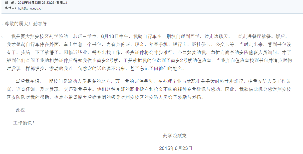 上一篇:来自翔安校区学生的一封表扬信
