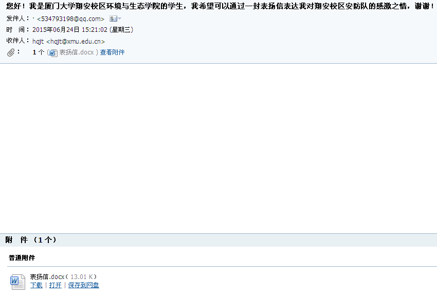 来自翔安校区学生的一封表扬信 每每提起厦门大学,感觉印象最深刻的就是它的人性化管理。免费的米饭供应,性价比高的可口饭菜,免费的自来水供应等等,让身为厦大学子的我们常常感动不已。此外,对于我来说,作为翔安校区的一份子,翔安校区的安防队的叔叔阿姨们的热情友善更是让我收获很多的温暖与感动。 每天,当早上我们迈着轻快的步子走出宿舍和晚上拖着沉重的步伐踏入宿舍园区时,迎接我们的都是宿管叔叔阿姨们明媚友善的笑容。寄放东西时的热情回应,学习晚归时的关切问候……这所有的一切都让身处异地求学的我们感受到家庭般的温暖。宿舍园区叔叔阿姨与我们的热情互动,让我们在闲暇时拥有聊天倾诉的好对象,让我们在困惑时获得长辈们指引人生的重要指示,让我们在孤独难过时收获家人般的安抚慰问…… 一年一度的毕业季,让我们舍不得的不仅仅有老师同学,还有对我们关怀备至,默默地为我们付出,为我们守候在学校的“家”的安防队的叔叔阿姨们。宿舍楼前,随处可见的即将离开的学子们与叔叔阿姨们的合影留念和深情拥抱,是彼此深厚感情的真切体现。此时一别,不知未来何年何月何时才能再次相聚,可是,不管怎样,叔叔阿姨们为我们的付出会永存在我们心中,成为我们绚丽美好的大学生活中的重要组成部分。 环境与生态学院学生