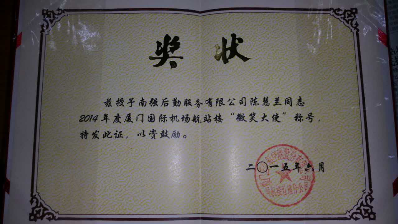 喜 讯 厦门南强后勤服务有限公司餐饮项目部陈慧兰同志荣获2014年度厦门国际机场航站楼颁发的“微笑天使”称号。