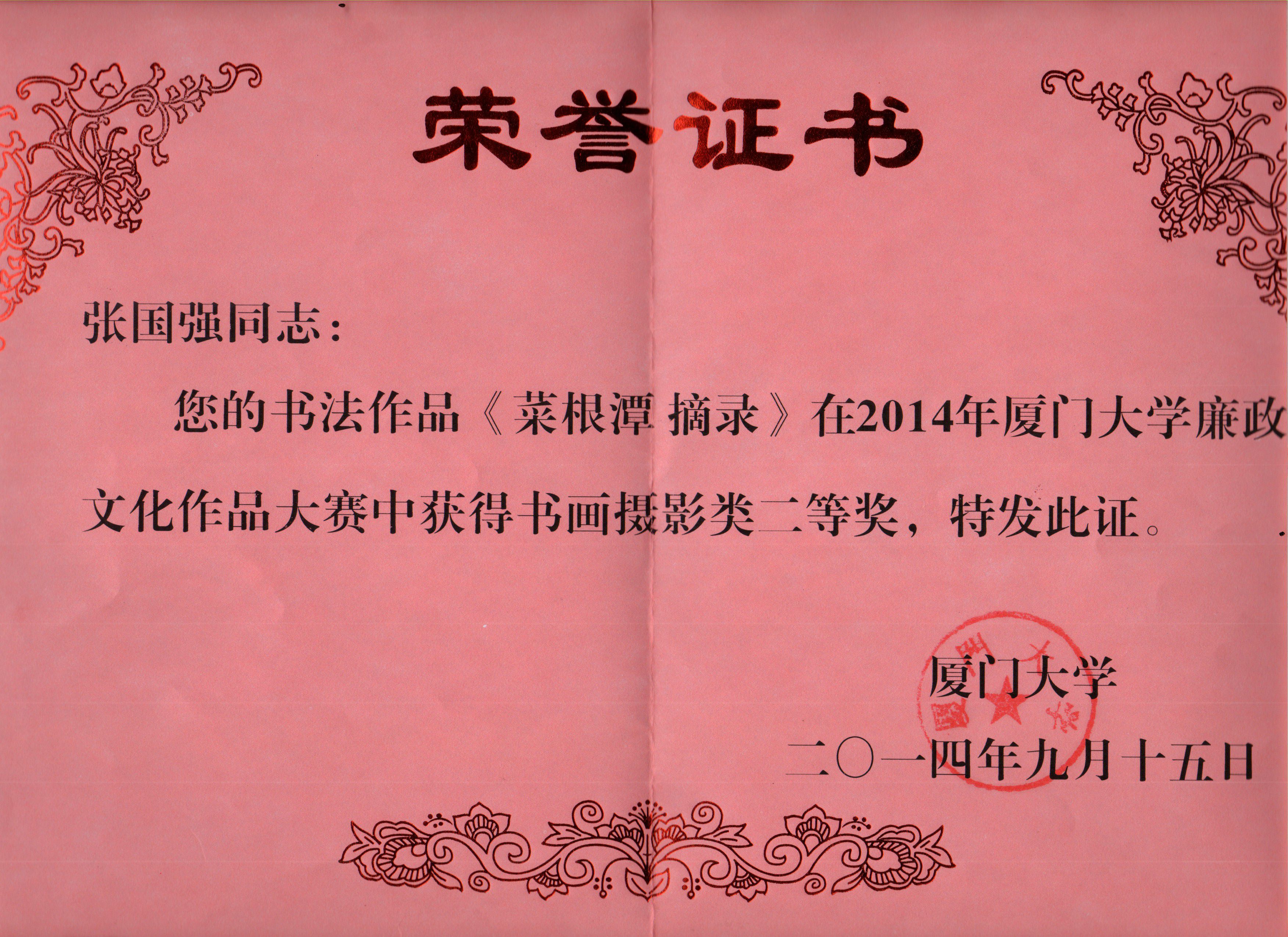 喜 讯 集团印刷服务中心副主任张国强同志书法作品《菜根潭摘录》在2014年厦门大学廉政文化作品大赛中获得书画摄影类二等奖。