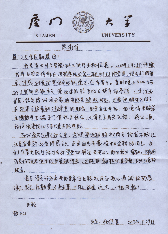 上一篇:厦大附中致南强物业公司的感谢信2