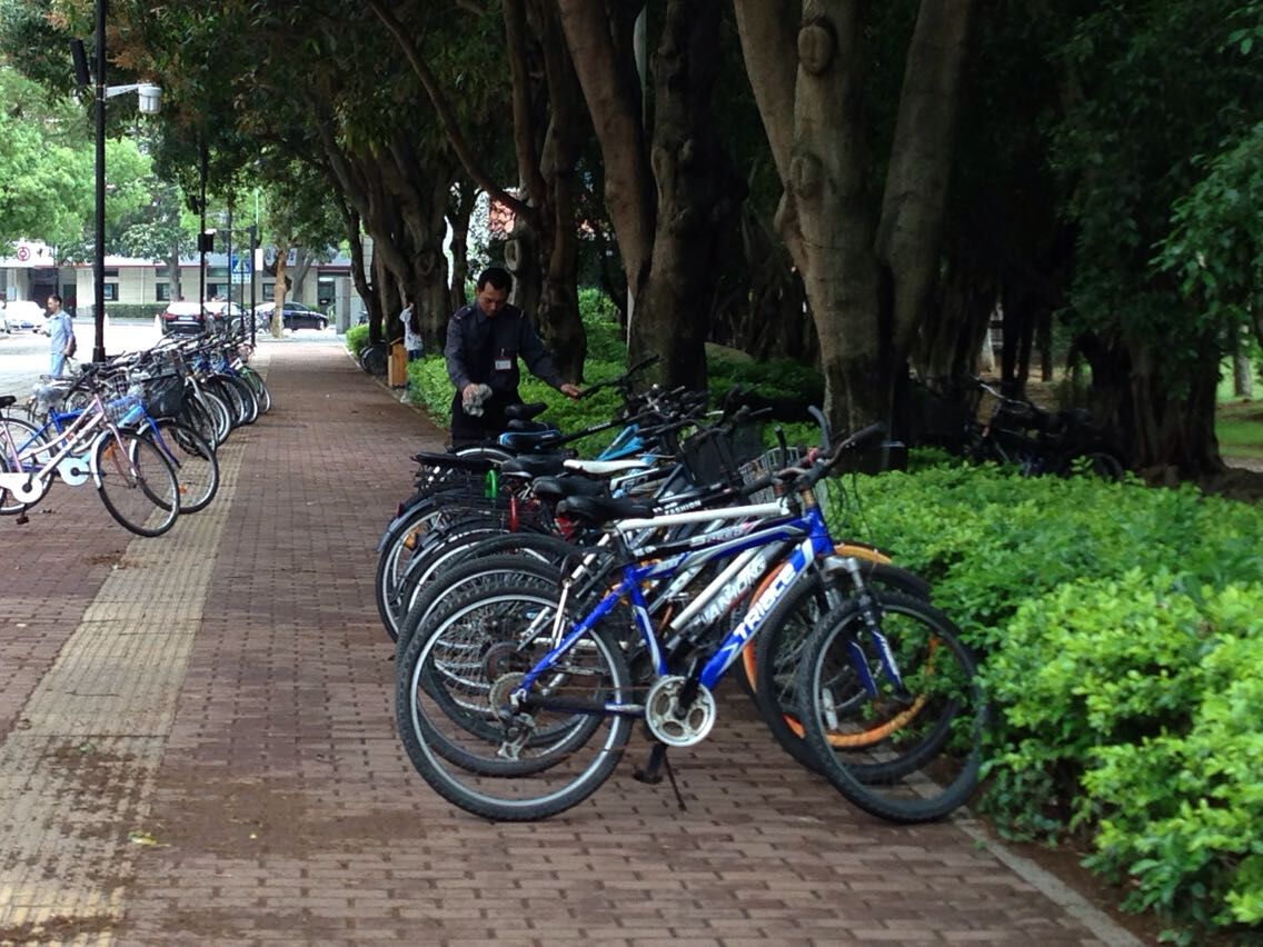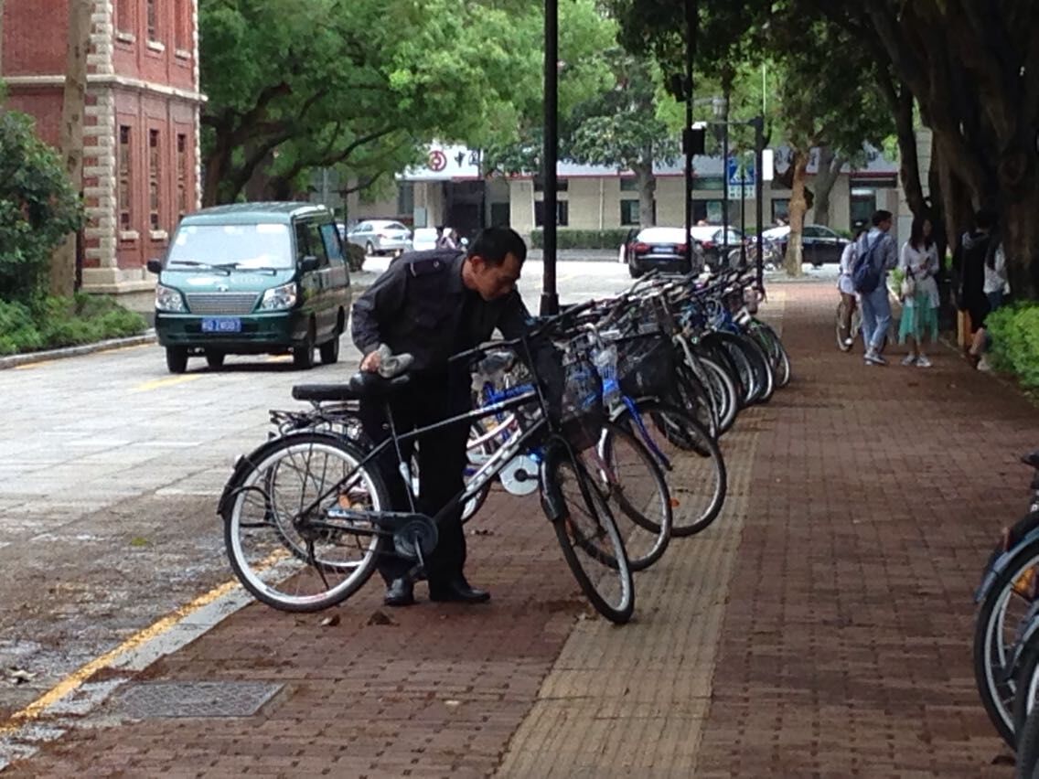 一块抹布,一个小举动,细微服务中见真情 今天上午,笔者到学校办事,走在三家村人行道上,只见一个保安手拿一块抹布,对着一辆自行车擦拭,然后搬到前方摆放整齐,刚开始我以为他在擦拭自己的车,就没太在意,继续前行,走了一会,抬头发现他还在重复着擦拭、摆放的动作,一辆接一辆。笔者忍不住走过去与其攀谈,谈话中了解到,该保安姓庄,是芙蓉2的保安,昨夜的大雨导致路边的芒果花落了很多,学生停放在路边的自行车座位、篮子都落满了花,比较脏,不方便骑,而且整理下保洁人员方便打扫,所以他就走出来整理。 简单的几句话,却是那么的质朴!其实他值班的芙蓉2在马路的对面,而自行车又不是停放在楼道,擦拭、整理摆放车不是他的职责,无关他任何事,他完全可以不做,可是他的这个小小的举手之劳,却方便了学生,使校园更加整洁;这小小的举动,也让我们的校园更加温馨美好! 笔者拿起手机,想拍一段小视频记录下这美好与大家分享,可惜这该死的手机很不给力,在这个时刻没电了,只留有刚才随手拍的几张照片。 厦大身边人
