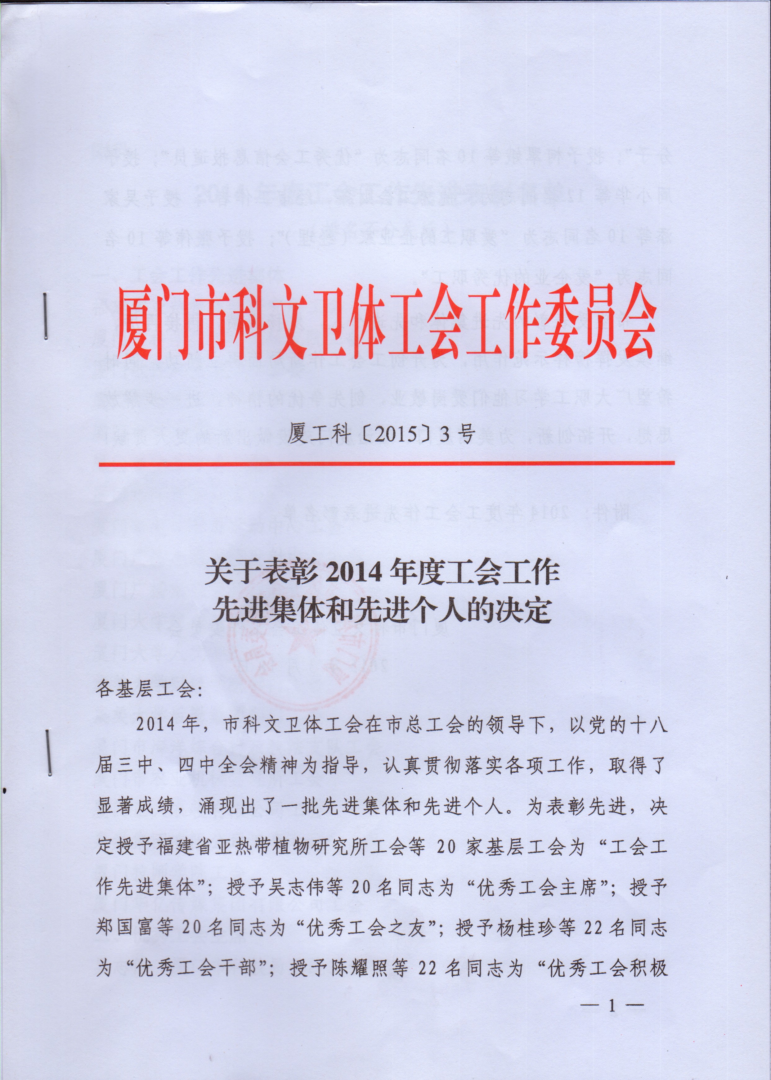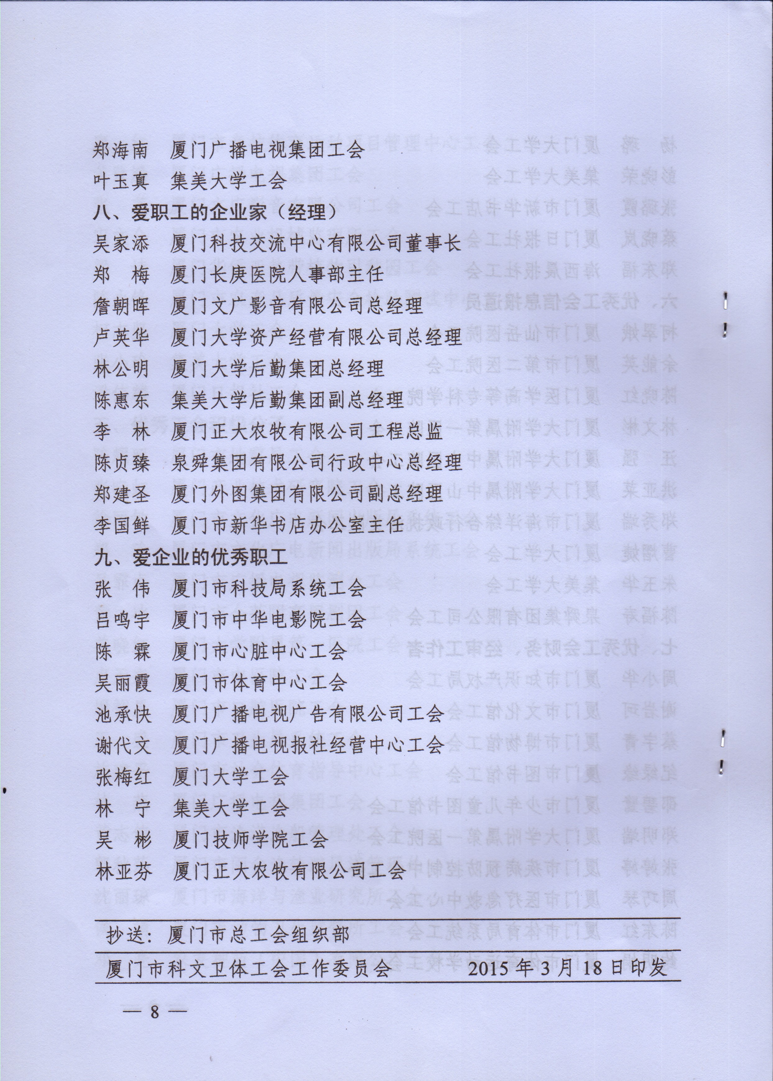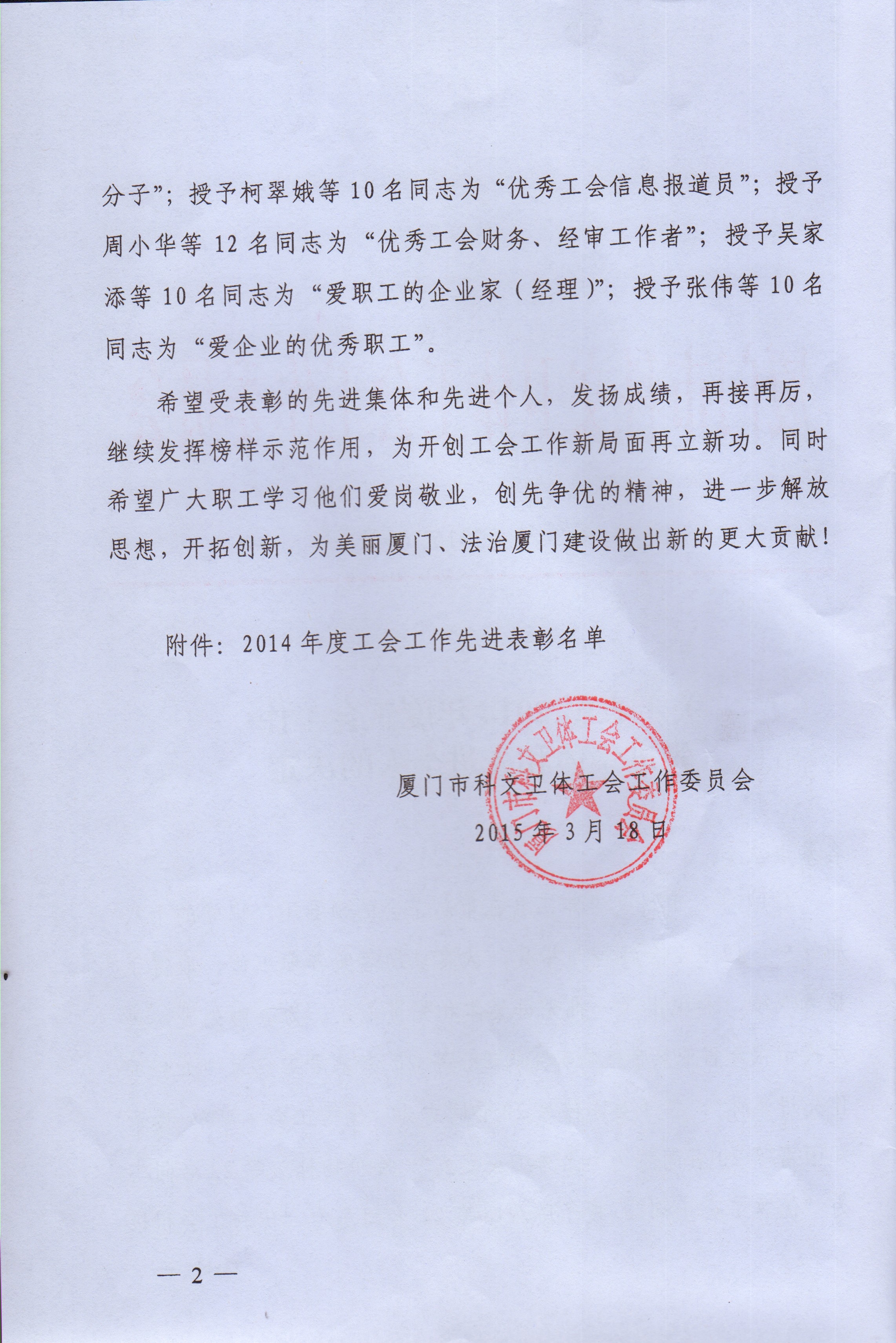 后勤集团总经理林公明同志荣获厦门市科文卫体工会授予的2014年度“爱职工的企业家(经理)”荣誉称号。