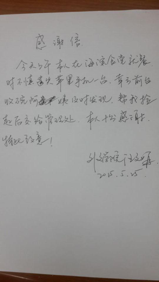 感谢信 今天上午本人在海滨食堂就餐时不慎遗失苹果手机一台,幸亏前台收碗阿姨及时发现,帮我捡起后交给管理处。本人十分感谢。 特此致意! 外文学院学生 2015.5.25