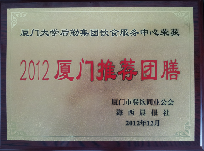 饮食服务中心荣获2012厦门推荐团膳称号 在华人策略celue饮食服务中心全体“厦大餐饮人”的共同努力下,饮食服务中心荣获厦门市餐饮同业公会授予的“2012厦门推荐团膳”称号。