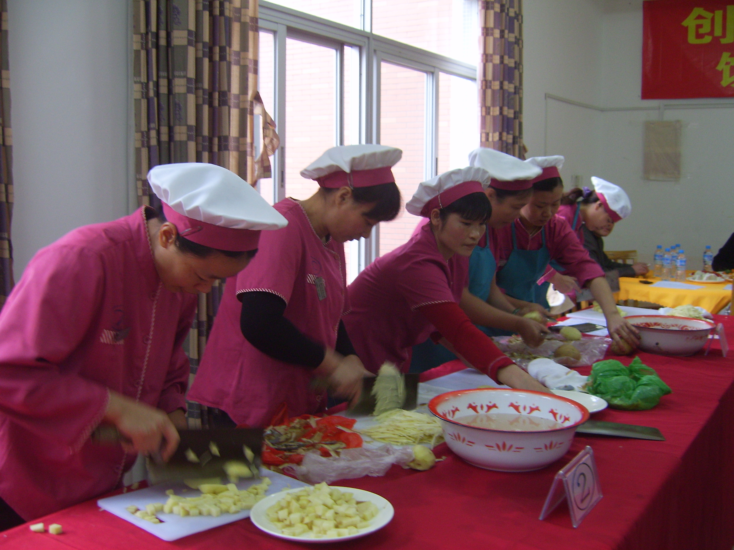 饮食服务中心举行技能比赛 2010年12月10日中午,饮食服务中心在芙蓉餐厅三楼举行创先争优系列活动之饮食服务中心技能比赛。本次比赛由饮食服务中心团总支组织实施,目的在于通过本次比赛,展示员工厨艺技能,增强员工团队精神,进一步展现餐厅员工以实际行动在本职岗位上创先争优的良好风貌。 本次技能比赛分为团体比赛和个人比赛两类,团体赛由校本部8家餐厅(勤业餐厅、凌云餐厅、东苑餐厅、芙蓉餐厅、海滨餐厅、公寓一餐厅、公寓二餐厅、海韵园餐厅),漳州校区三家餐厅(北区餐厅、中区餐厅、南区餐厅)以及校外餐厅各一支代表队参赛,个人赛由各餐厅选派选手参加。为了增进餐厅与学生之间的交流,本次比赛还专门邀请校学生会权益部两名干事担任评委。 下午2点,比赛开始,选手们眼疾手快,刀工娴熟,切出来的土豆丝粗细均匀,土豆丁大小匀称。比赛结束后,中心副主任张金满、支部书记陈主伟、办公室主任王涛、团总支书记王湘等为比赛的优胜者颁发了奖状和奖品。 集团党总支书记叶鹏飞,党总支副书记庄惠美和集团团委书记林琳莅临现场观摩了比赛。 饮食服务中心团总支:王 湘