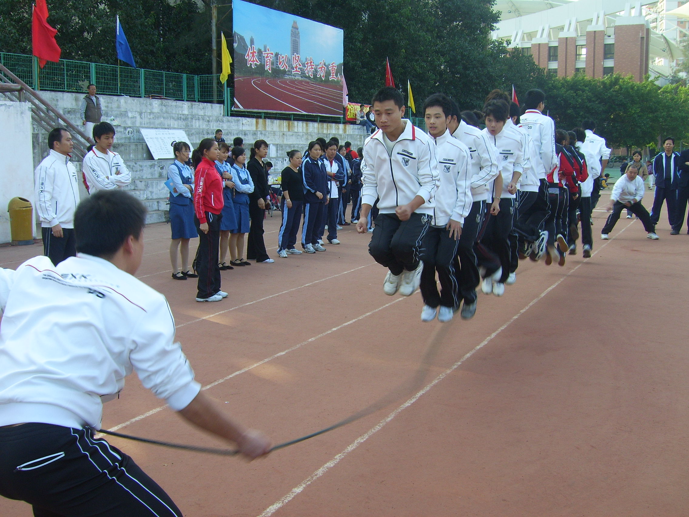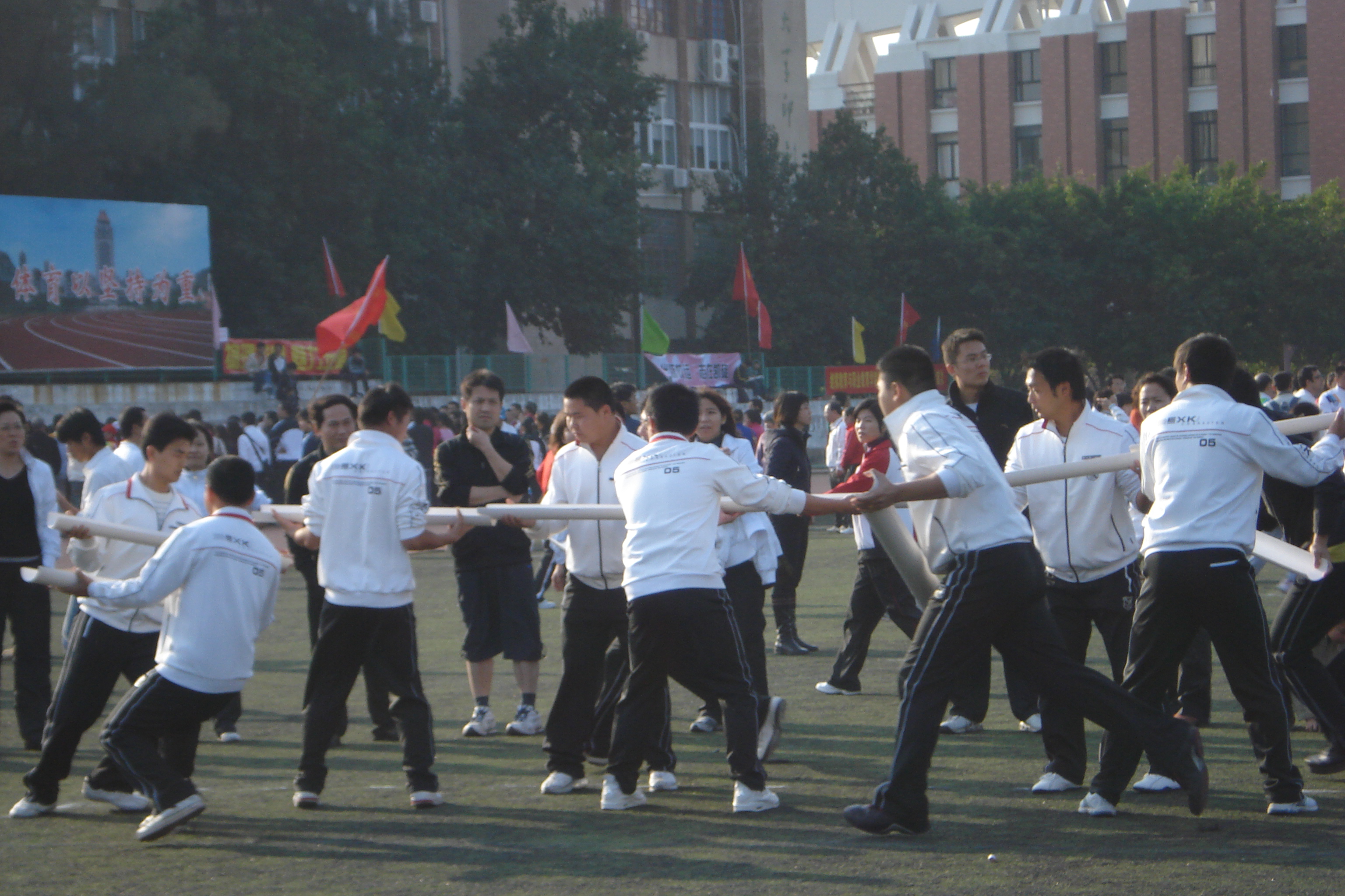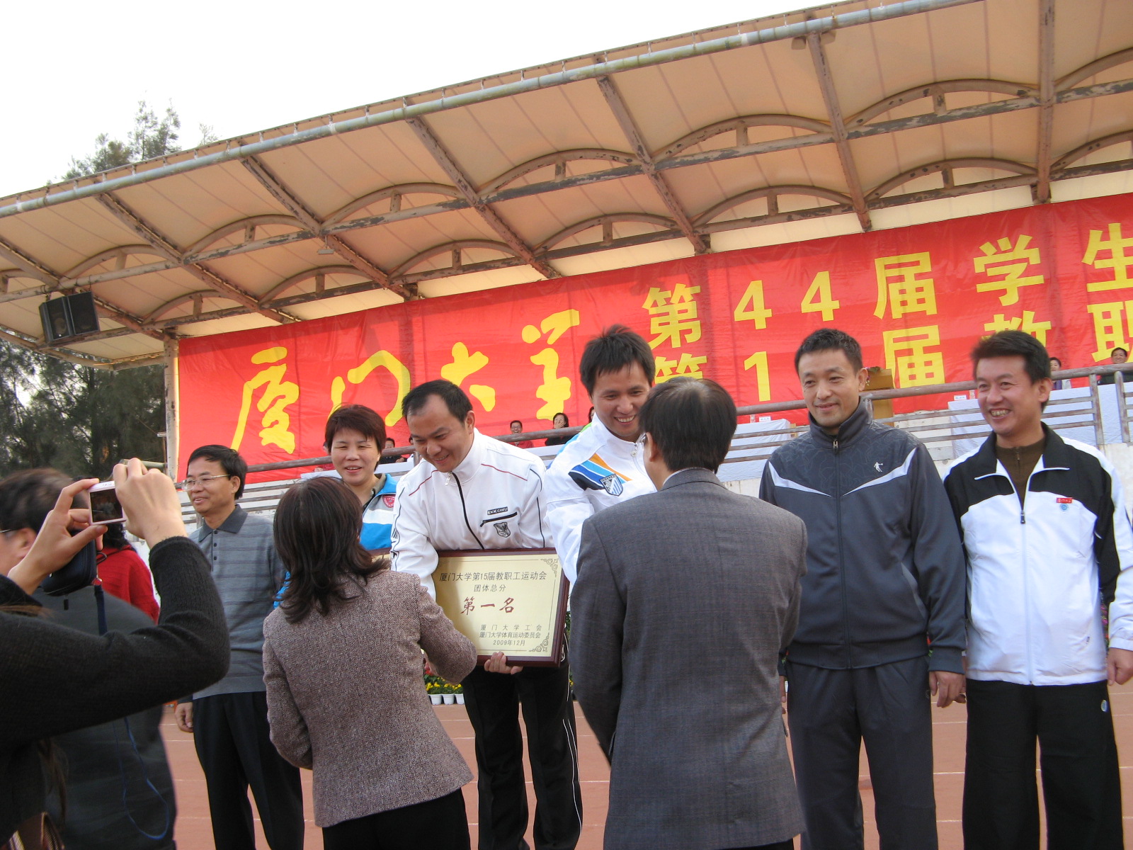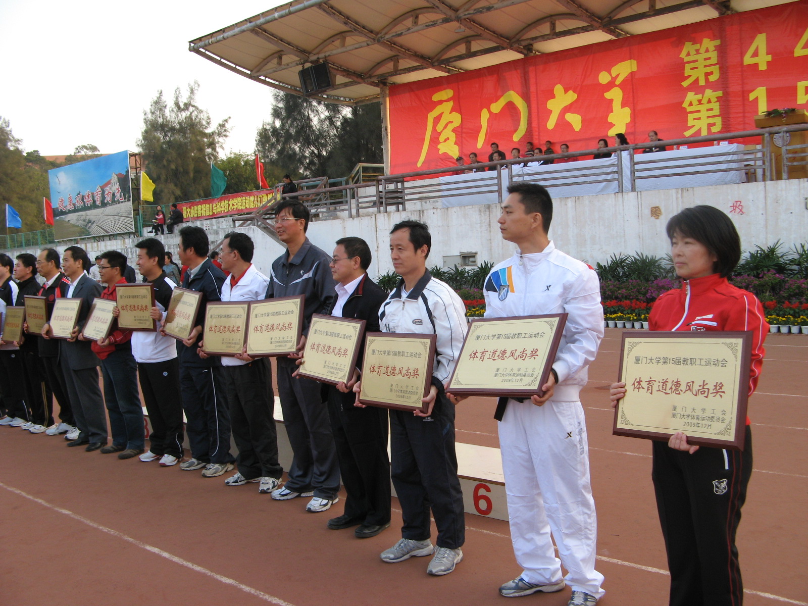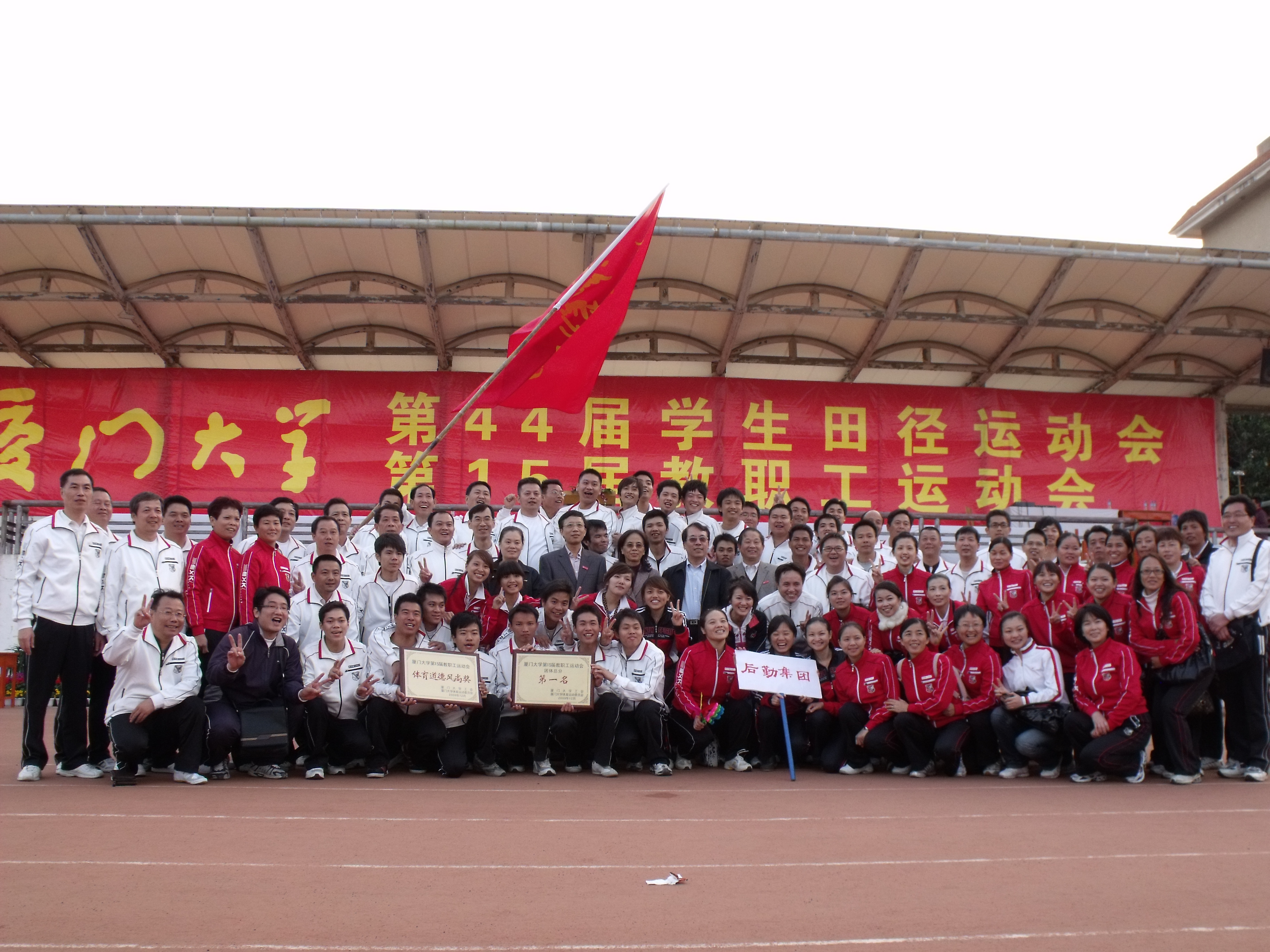 后勤集团在我校第15届教职工运动会上 取得团体总分和道德风尚奖双冠军 在12月5日召开的厦门大学第15届教职工运动会上,后勤集团的运动健儿奋勇拼搏,以总分298分的成绩荣获本届运动会团体总分第一名和体育道德风尚奖第一名的双丰收。 开幕式上,当后勤集团的方队迈着矫健整齐的步伐走过主席台时,成群放飞的和平鸽,表达了后勤人对学校事业蒸蒸日上的美好祝福;嘹亮的口号——“锻炼身体、增强体质、加强服务、提高质量”道出了后勤人服务师生、踏实工作、努力奉献、勇于进取的豪情! 闭幕式上,当大会宣布后勤集团成绩的那一霎那,在场的集团全体运动健儿和后勤保障人员沸腾了!这一刻的到来,凝聚了集团领导多少期望,从运动会前期的筹备工作,到入场式预演以及运动会现场,集团领导班子全员参加;这一刻的到来,凝聚了集团运动健儿多少汗水,持之以恒的训练,赛场上的全力拼搏,不轻言放弃的坚韧品格和勇创佳绩的壮丽豪情;这一刻的到来,凝聚了集团后勤保障工作人员多少心血,无论是教练员还是啦啦队,无论后勤保障组还是宣传组,都心往一处想,劲往一处使,兢兢业业、勤奋工作。 据悉,后勤集团自2002年12月成立以来,参加了学校举办的第10届至15届教职工运动会,共取得了5次团体总分第一名和1次团体总分第二名的好成绩,并连续6次取得了体育道德风尚奖。 在当晚的总结会上,大家共识到取得成绩的经验和精神是:领导重视、上下齐心、提前谋划、精心组织、积极参与、准备充分、步调一致、团结协作、刻苦训练、讲究方法、勇于拼搏、争创一流。集团上下都表示要将运动会上的好经验和体育精神带到实际工作中,为学校教学科研事业以及集团的发展再立新功! 后勤集团办公室:林琳 2009-12-6