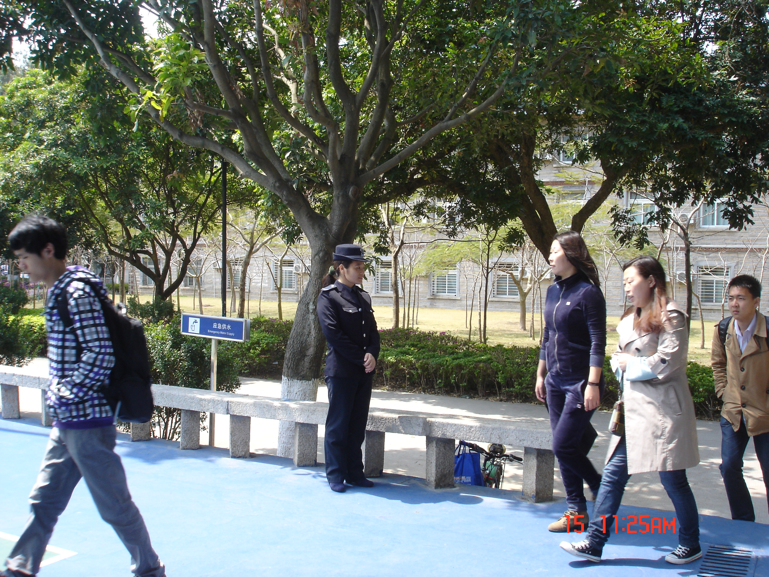 刚接手维序工作,我也不是很适应,尤其是中午学生们下课那叫一个人多啊,我总觉得站在路口拿眼睛扫视那么多过往的人实在有点不好意思,于是买了幅小墨镜戴上。有时东边场上来了尖跟鞋西边场上又来了自行车,我急得不行,大声了怕给人不礼貌的印象,小声了人家又装着没听到,只好多跑动到人面前劝说,多亏了这双“飞毛腿”,看到同学一脸的歉意并表示下回注意的话我就觉得自己的辛苦没有白白付出,擦擦额头上的汗水,也觉得舒心。刚开始一个星期工作下来,就略显成效,推自行车穿行球场者明显减少了,有同学一看我在值班自觉就推车绕道了,穿尖跟鞋的女生也主动绕行了,每每这时我的成就感油然而生,嘴角不觉间就上扬了,我开心了呗。
