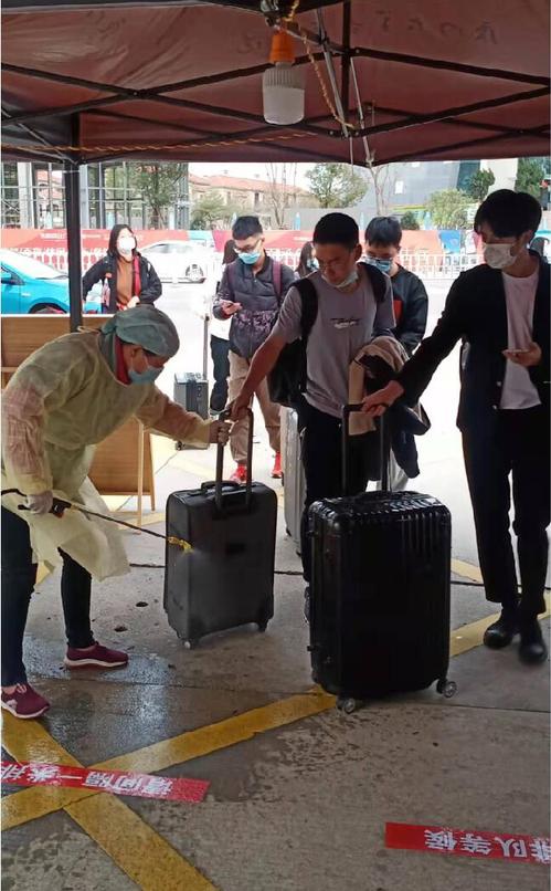 学生返校期间,校门安防人员对入校学生进行体温检测、查看健康码、行程码,对学生行李进行消毒;宿舍安防人员检测入住学生体温、登记返校信息,保障了学生安全有序返校。
