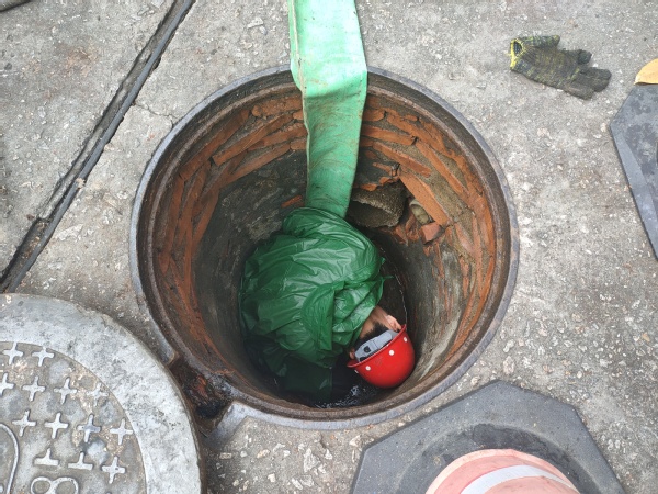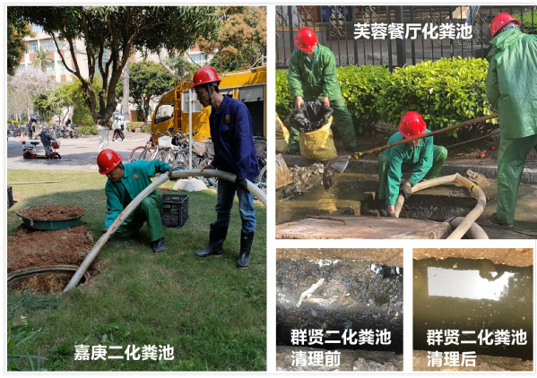 南强物业人不畏脏臭,利用吸粪车、捞渣勺等清掏工具,甚至亲身进入井道内作业,先后对海滨餐厅、化学楼图书馆管等50余处化粪池进行清掏、疏通。