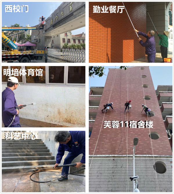 校内许多建筑在多年的风雨侵蚀和藤蔓植物的攀爬下逐渐斑驳,地面也布满许多顽固污垢。为重新焕发建筑的光彩,南强物业人不惧高空,利用高空作业车、高压水枪、高空作业绳等专业工具,为学校西校门、凌云隧道、勤业食堂等近20处开展了深度、全面的清洗工作。
