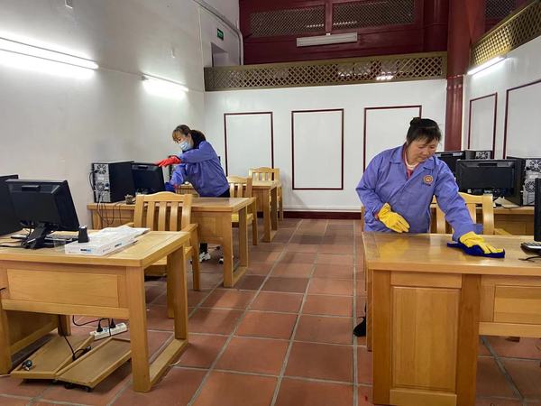 2020年8月,各展厅开始了拆装、施工。众多校外施工人员进入现场,成堆的布展材料码放在周围,半年多的施工期,都为校史馆的维序和保洁工作带来巨大挑战。项目组不分年节、加班加点坚守在岗位上,保障了校史馆施工期间安全有序、清洁卫生。