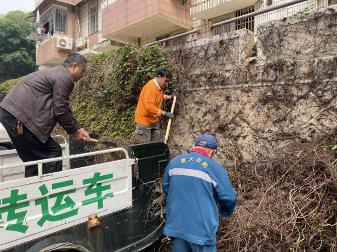 对东区部分挡土墙上枯萎和掉落的爬山虎进行清理和修剪
