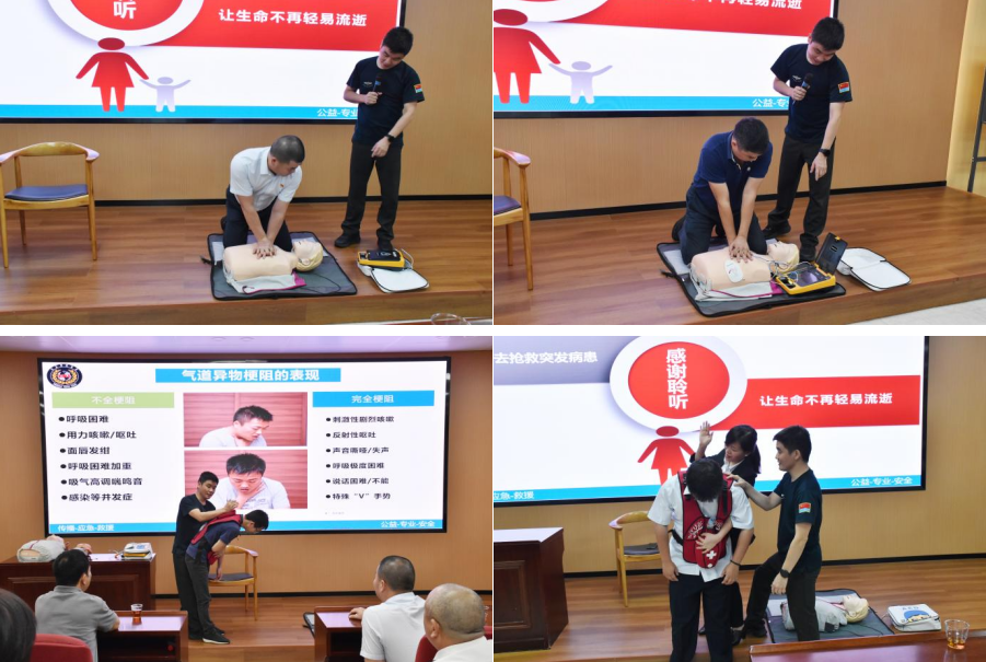 此次培训邀请厦门枭龙应急救援队队长谢俊林老师进行授课。在培训中,谢俊林老师以生动的案例和实用的技巧向大家普及了急救的基本原则和操作流程,并对救助过程中容易出现的错误和问题进行了重点强调。他还详细讲解了心肺复苏(CPR)的正确步骤、自动体外除颤器(AED)的使用方法,以及海姆立克急救法的操作要点。