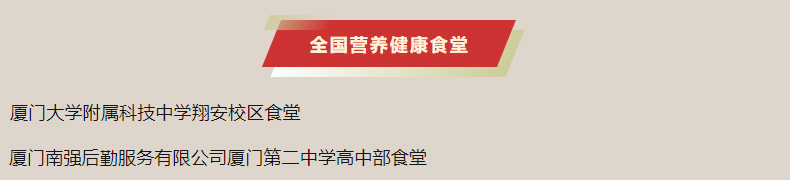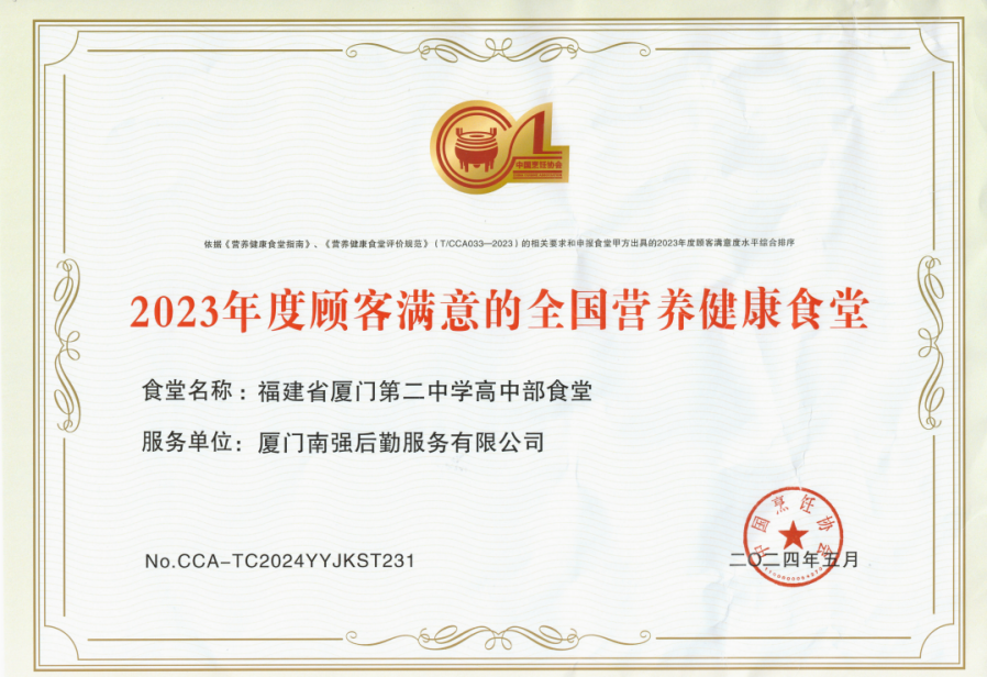 为贯彻落实《健康中国行动(2019—2030 年)》合理膳食行动、《国民营养计划(2017—2030 年)》《餐饮服务通用卫生规范》《餐饮业反食品浪费管理通则》等相关要求,促进团餐产业健康高质量发展,2024年3月,中国烹饪协会向全国开展“2023 年度顾客满意的全国营养健康食堂”调研工作,厦门南强后勤服务有限公司所经营服务的厦门大学附属科技中学翔安校区食堂、厦门第二中学食堂经过中烹协线上和线下的现场严格评选,入选“2023 年度顾客满意的全国营养健康食堂”!