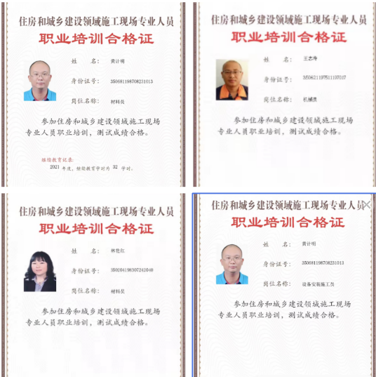 维修部有13名员工,11名男员工全部持有电工操作证,同时有6名取得高级、中级、初级电工等级证书,2名持有高压证书,4名取得八大员证书中的材料员证、机械员证、设备安装施工员证及安全管理员证书;2名女员工为仓库管理员和系统管理员,分别获得厦门大学三八红旗手荣誉称号和取得八大员证书的材料员证。