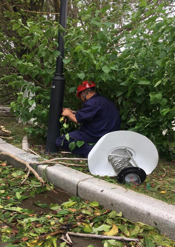 “无论什么情况,后勤人都在你身边。”2021年8月11日,“米克拉”台风正面袭击漳州开发区,校区主次干道到处是倒伏树木、路灯,一遍狼籍,同时校区突发停电,水电维修部副经理黄计明舍小家顾大家,连续十多天加班加点,带领水电抢险队奋力救灾。台风过境当天,第一时间切断265盏倒伏和损坏的高杆路灯、庭院灯、草坪灯电源确保不漏电;做好校区17个低压开关站应急送电工作,在上午9:00前恢复校区正常供电。台风灾后,水电维修部共抢修、扶正受损高杆路灯、庭院灯、草坪灯等385盏(根)。