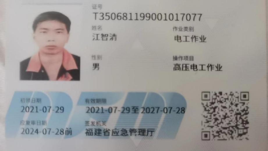 员工江志清,在集团2020年人才培训主题建设年期间,积极主动报名高压证取证培训,通过半年多的自主学习与实操培训,顺利考取高压电工证。