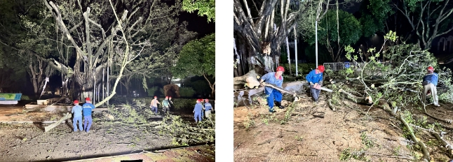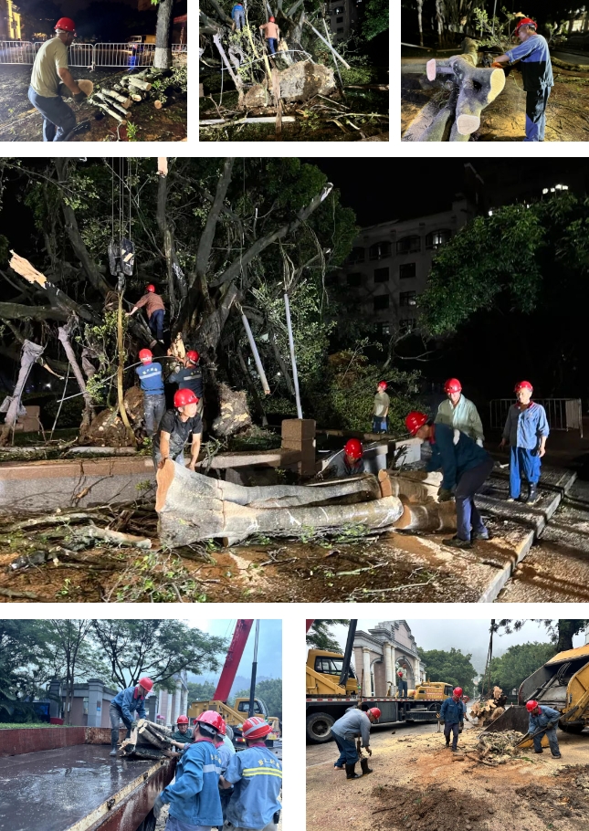 由于大榕树主根已腐烂,无法重新种植,抢险队员开始对大榕树进行切割处理并运走。大榕树的树冠、胸径大,枝叶繁茂,工作量巨大,抢险队员通宵达旦进行清理,清理工作整整持续了12个小时。