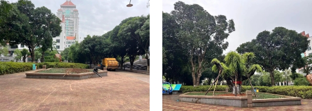 大榕树承载着许多师生的回忆,早已成为校园的一道景观,它的倒伏让大家惋惜连连。为此,6月初,在资产与后勤事务管理处的指导下,中心绿化保洁部对原大榕树所在位置的土壤进行更换,喷洒土壤杀菌剂,并精心挑选了一株新的榕树种植。